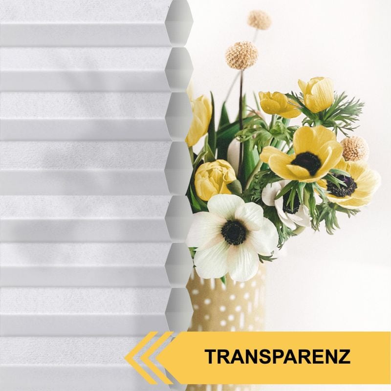 Das Wabenplissee Dona ist ein transparenter Stoff und hat eine Lichtdurchlässigkeit von 33 %. Durch diesen Lichtfilter werden Ihre Räume vor direkter Sonneneinstrahlung geschützt und das einfallende Licht sanft und angenehm gedämpft. Für eine absolute Privatsphäre sorgt die blickdichte Wirkung des Stoffs, damit Sie ungestört und ohne fremde Blicke in Ihrem eigenen Zuhause leben können.